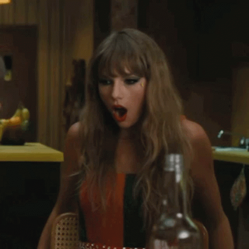 Taylor Swift looking shocked with her mouth open, from the Anti-Hero music video.