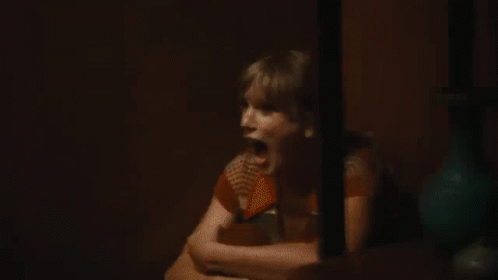 Taylor Swift in her 'Anti-Hero' music video, first appearing in a ghost costume, then revealing herself.