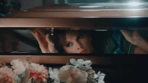 Taylor Swift peeks out from a coffin adorned with flowers in her 'Anti-Hero' music video.
