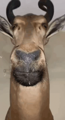 A close-up of an antelope-like animal's face with horns, looking directly at the camera.