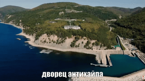 Aerial view of the 'Palace of Antihype' associated with Zamay and Slava KPSS, located by the sea.