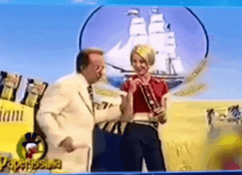 Antonella Elia and Mike Bongiorno on the Italian show Paperssima, with Mike gesturing towards her.
