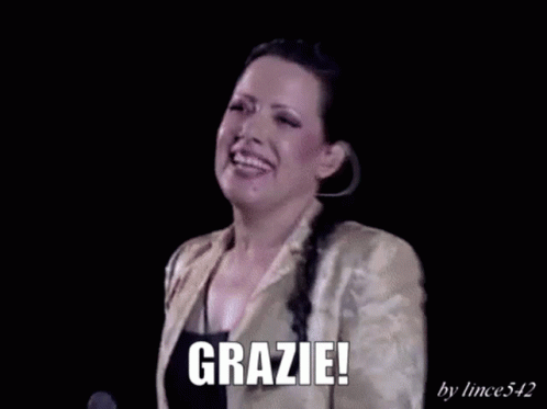 Antonella Ruggiero smiles and says 'Grazie!' to the audience, expressing her thanks after a performance.