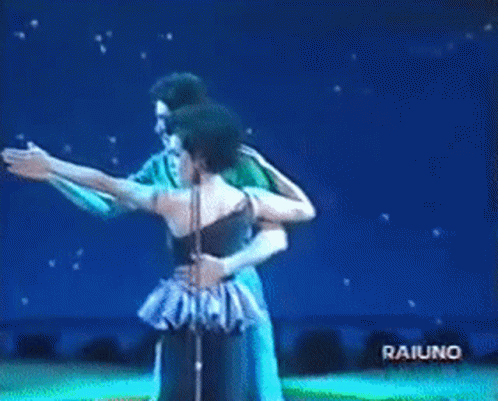 Antonella Ruggiero of Matia Bazar performs a dance with a partner on stage, broadcast by RAIUNO.