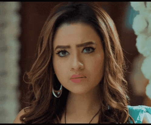Anupama making a funny face, with long hair and hoop earrings, looking directly at the camera.
