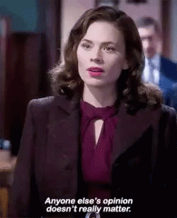 A woman in a suit and purple shirt confidently states that anyone else's opinion doesn't really matter.