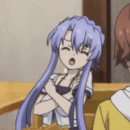 a girl with long purple hair is sitting at a table with her arms crossed .