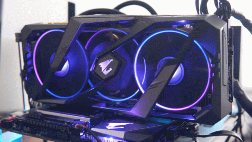 Aorus Extreme RTX GPU showcasing its vibrant RGB lighting while powered on and connected to a motherboard.