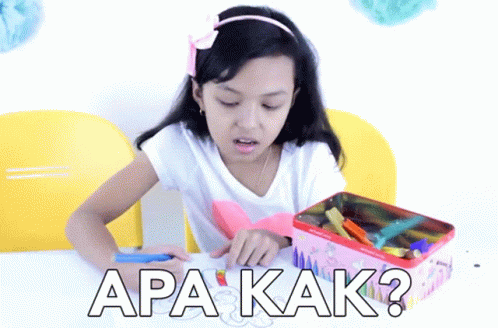 Keira Charma drawing and coloring, looking up and asking 'Apa Kak?' (What, Sis?).