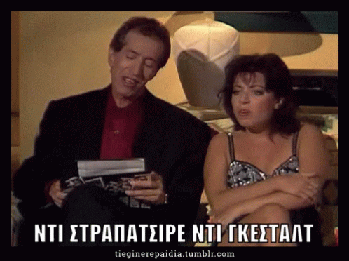 A classic meme from the Greek TV series Aparadektoi, featuring the iconic 'Nti Strapatsire Nti Gkestalt' dialogue.