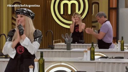 Charlotte Caniggia claps enthusiastically in the Masterchef Argentina kitchen, with Mery Del Cerro and Héctor Enrique in the background.