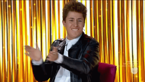 Juanpa Zurita claps enthusiastically, smiling in a black leather jacket against a golden background.