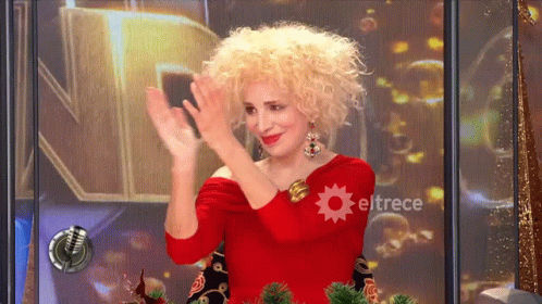 Nacha Guevara smiles and claps enthusiastically in a red dress on the El Trece set.