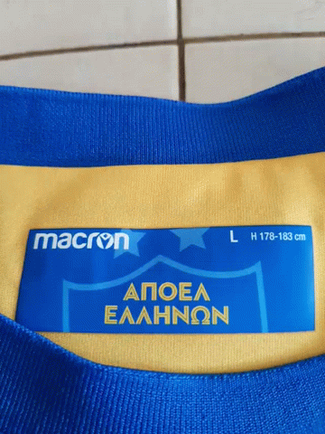 Close-up of an APOEL football club shirt, featuring the Macron brand tag and the club's crest with two stars.