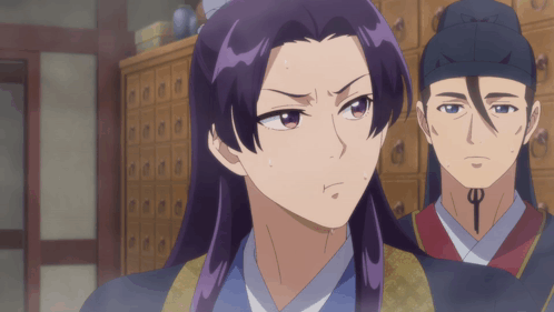 a man and a woman are standing next to each other and the woman has purple hair
