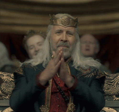 King Viserys Targaryen, played by Paddy Considine, claps and applauds during a scene from House of the Dragon.
