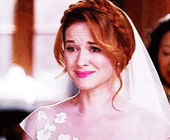 April Kepner from Grey's Anatomy, a happy bride in her wedding dress and veil.