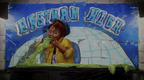 a painting of a boy vomiting in front of a sign that says " eastman high "