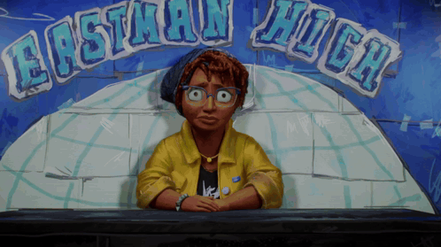 a cartoon drawing of a person sitting in front of a sign that says eastman high