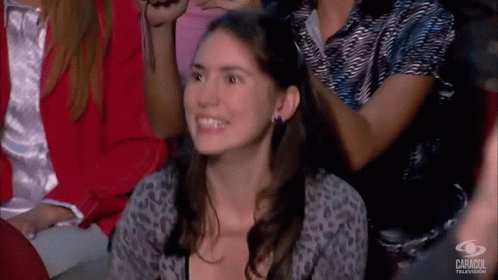 Smiling woman in leopard print sweater gives two thumbs up in a crowd, sponsored by Caracol Television.