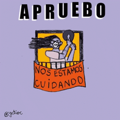 Animated 'Apruebo' message: people on balconies with signs about self-care and not forgetting.