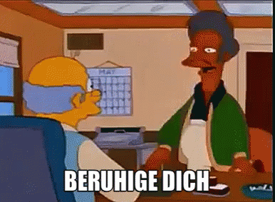 Apu from The Simpsons tells someone to 'BERUHIGE DICH' (Calm Down) in a classic scene.