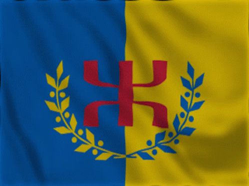 The Aqbayli Mak (Kabyle) flag, featuring blue and yellow halves with a red Amazigh symbol and olive branches, waving.