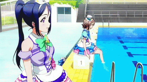 Aqours and Kanan, with You, relaxing by the pool in their vibrant idol outfits.