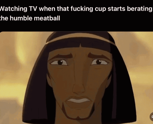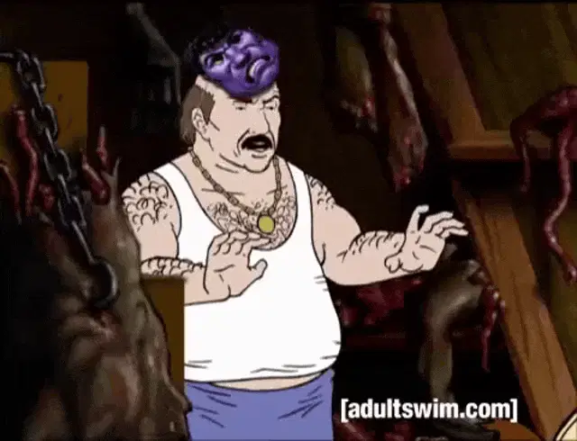 An Aqua Teen Hunger Force character runs in an ancient setting, paired with a meme about Master Shake berating Meatwad.