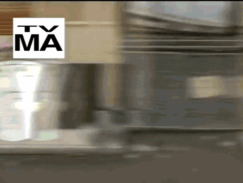 a tv ma logo is above a blurred image of a kitchen
