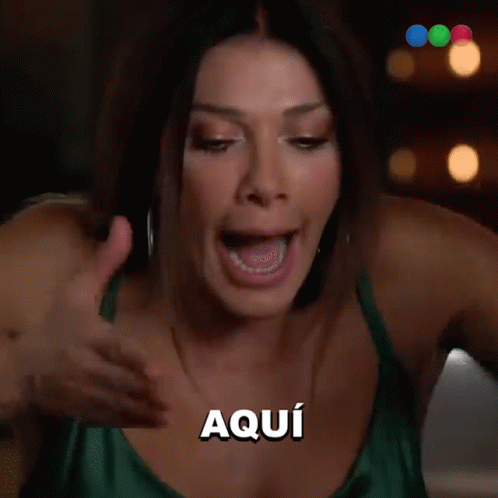Cathy Fulop, in a green dress, enthusiastically says 'Aquí' (Here) during MasterChef Celebrity Argentina.