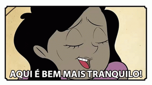 Cartoon woman with closed eyes, expressing peace with the text 'Aqui É Bem Mais Tranquilo'.