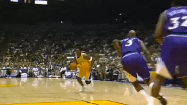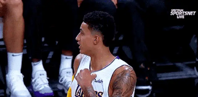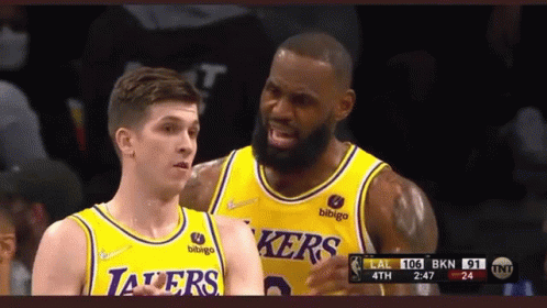 LeBron James interacts with Austin Reaves (AR15) on the Lakers basketball court during a game.