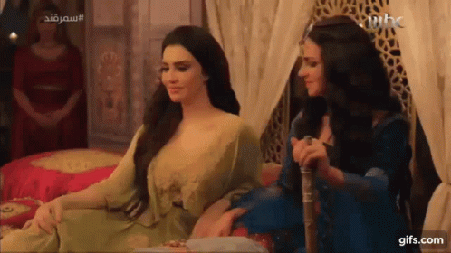 Two Arab women in traditional attire sit on a bed, one holding a cane, in a scene from the Samarkand drama.