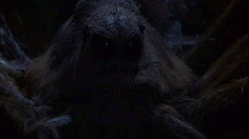 A terrifying close-up of Aragog's glowing eyes from the Harry Potter series, emerging from the darkness.