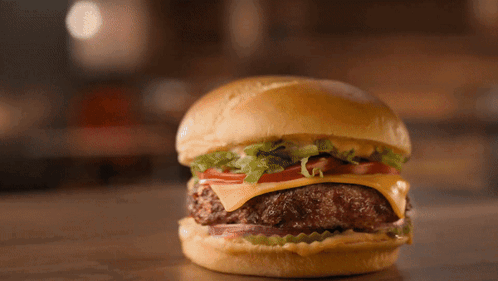 a close up of a hamburger with cheese lettuce and tomato on a table