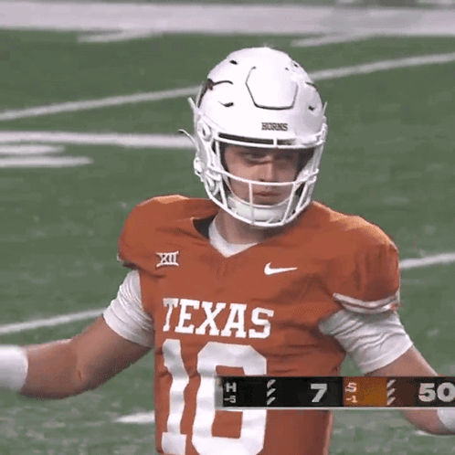Arch Manning, wearing a white helmet and an orange Texas Longhorns jersey with number 16, stands on a football field.