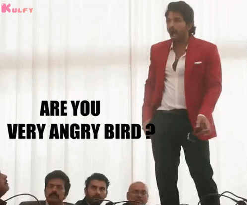 Allu Arjun in a red jacket asks, 'Are you very angry bird?' from the movie Ala Vaikunthapuramuloo.