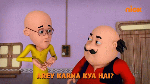 Motu asks Patlu 'Arey Karna Kya Hai?' (What do we have to do?) in a scene from Motu Patlu.