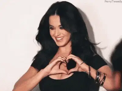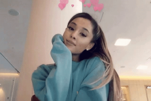 Ariana Grande smiling sweetly in a blue sweater, with a heart filter floating above her head.