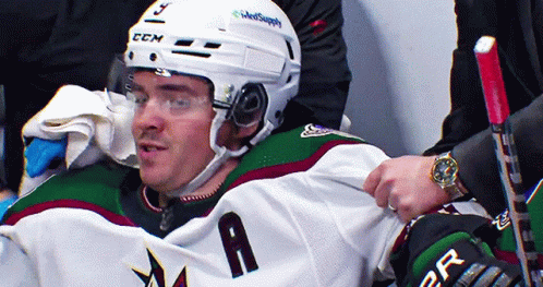 Arizona Coyotes player Clayton Keller smiles broadly while sitting on the bench during a hockey game.