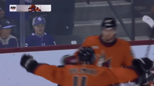 Jj Moser celebrates a power play goal with his Arizona Coyotes teammates on the ice.