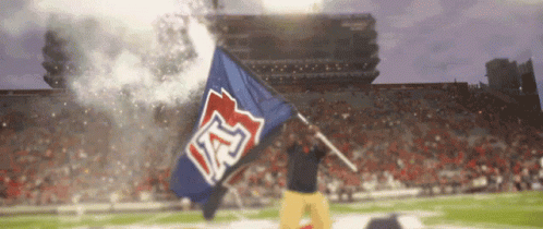 An Arizona Wildcats fan proudly waves the team flag on a football field amidst smoke and cheering, celebrating a game.
