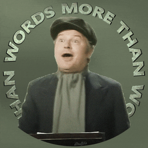 Benny Hill performs the 'Arm of Honour' forearm jerk gesture with 'Words More Than Words' text around him.