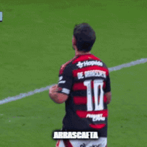 Flamengo's Giorgian De Arrascaeta, wearing his number 10 jersey, celebrates on the field after a play.