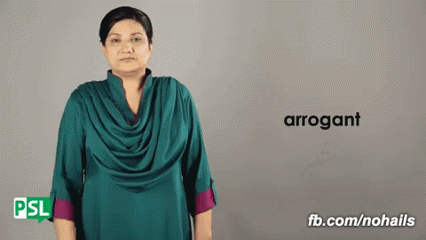 A woman demonstrates the sign for 'arrogant' in Pakistan Sign Language (PSL), with Urdu translation.