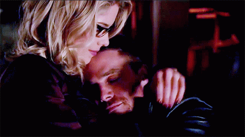 Felicity Smoak tenderly comforts Oliver Queen, stroking his hair in a loving embrace.