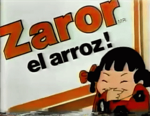 A cute cartoon 'Chinita' girl laughs happily in a vintage commercial for Zaror El Arroz rice from Chile.