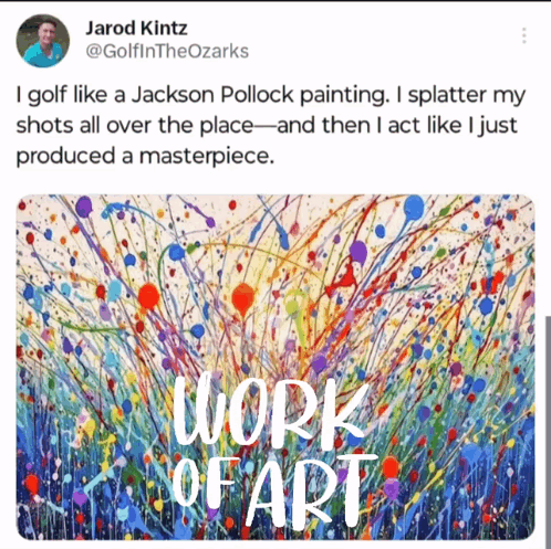 Jarod Kintz tweets about golfing like a Jackson Pollock painting, splattering shots and calling it a masterpiece.