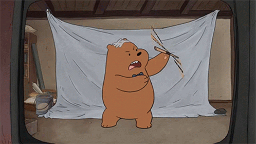 Grizzly Bear from We Bare Bears practices martial arts with a makeshift bow and arrow in front of a white sheet.